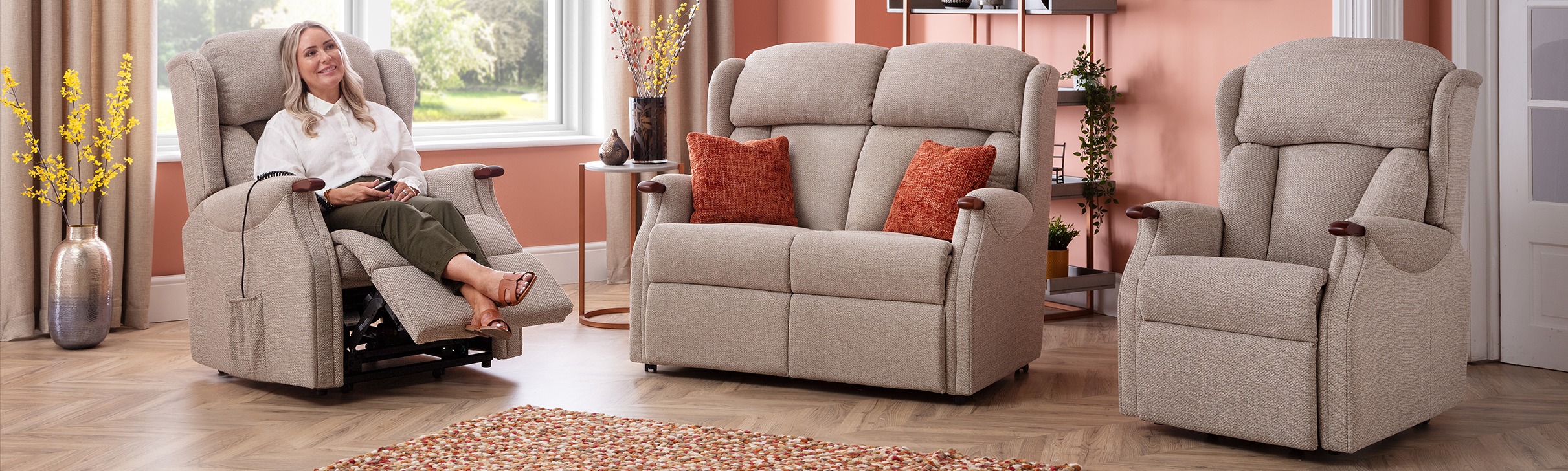 Designed for extra comfort with triple pillow back cushions and a choice of real wood grab handles, the Westbury is a traditional, yet comfortable recliner. Available in Grande, Standard, and Petite size chairs, with matching fixed settees. All models are available with or without knuckles in fabric or leather.
